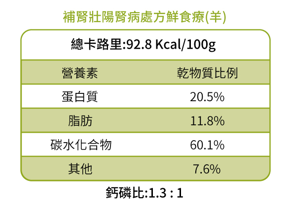 The recipe is designed for kidney diseases caused by kidney-yang deficiency. Dogs may exhibit symptoms such as unwell in cold weather, frequent and clear urination, lower back pain, fatigue, soft stools, or even edema. The menu uses a low-protein, low-phosphorus, and low-sodium formula, making it suitable only for dogs with kidney disease.