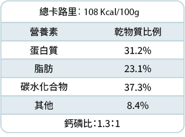 中醫角度分析,羊肉有暖補腎陽的效用。蛋白中醫稱之為雞子白,能潤肺養陰、清熱消炎。亦加入了杞子、黑芝麻、甘筍、西蘭花、薯仔等食材以滋補肝脾腎。特別適合因年老而體重下降、體力變差、需要增肥、因氣虛而引發慢性炎症等病狗去作調理的作用。